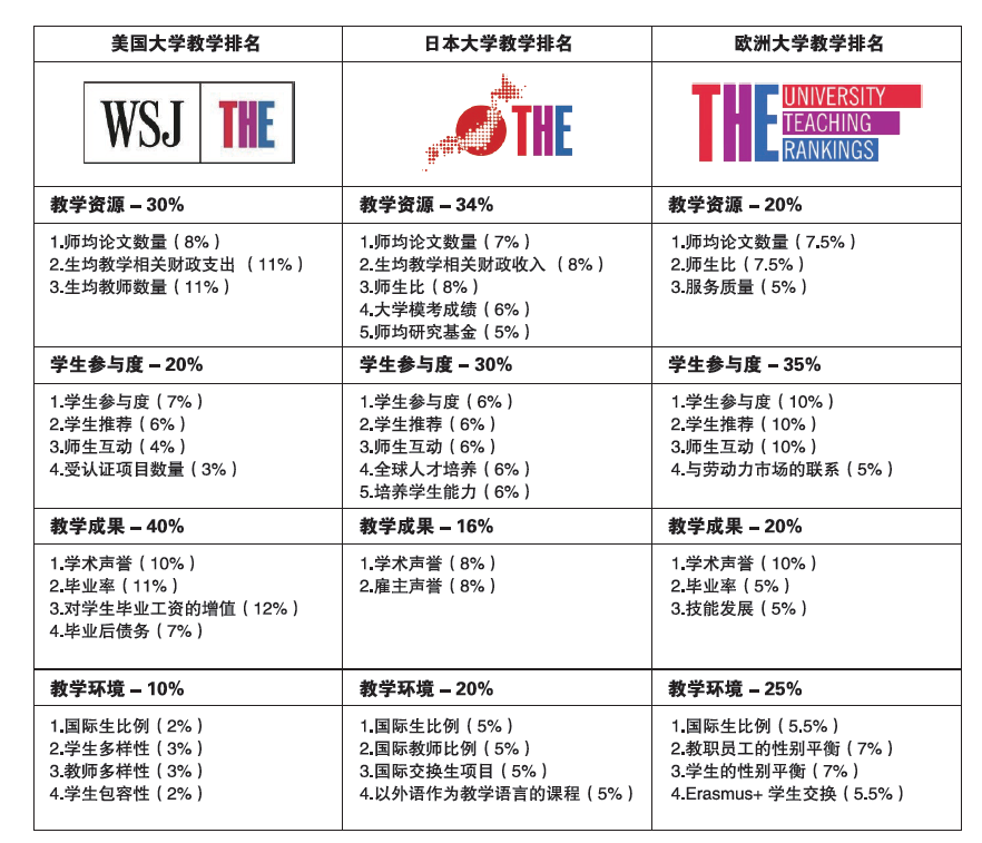 美國、日本和歐洲教學(xué)排名的評估體系盡管維度相同,但是在不同區(qū)域使用了不同的二級指標(biāo),評估的方法做到了本地化。例如,學(xué)生參與度維度中,美國教學(xué)排名考察了學(xué)科的廣度,在日本則使用了高中升學(xué)顧問調(diào)查;教學(xué)資源維度中,歐洲教學(xué)排名考察了服務(wù)質(zhì)量,美國和日本則沒用這個指標(biāo)。
