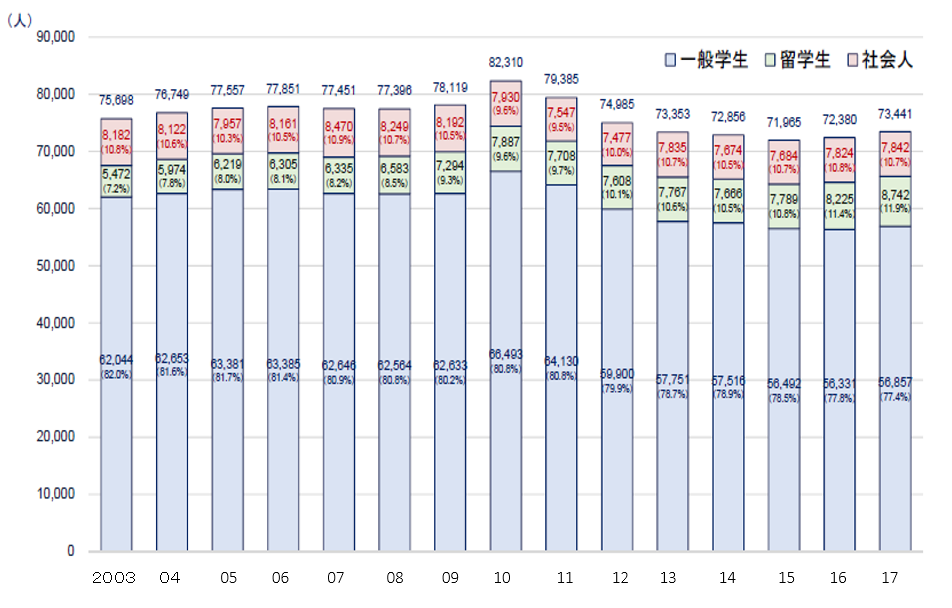 進入21世紀,應屆大學畢業生報考研究生人數逐漸減少,特別是博士報考人數下降。由于經濟發展停滯,導致研究生就業難問題。研究生教育政策也由規模擴大轉變為結構調整和質量提升。自2005年,基于中央教育審議會的三個咨詢報告《新時代的研究生院教育》(2005年9月)、《全球化社會的研究生院教育》(2011年1月)、《引領未來的研究生院教育改革(審議匯總)》(2015年9月),文部省先后發布了《第1次研究生院教育振興對策綱要》(2006年3月,實施期間:2006~2010年度)、《第2次研究生院教育振興對策綱要》(2011年8月,實施期間:2011~2015年度)、《第3次研究生院教育振興對策綱要》(2016年3月,實施期間:2016年度~2020年度)。