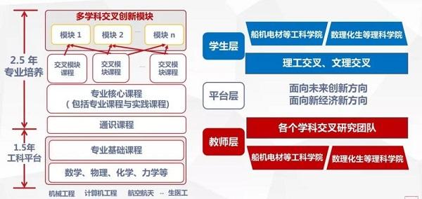 4.交叉融合。在交叉融合方面,學校正在探索多方向的專業(yè)培養(yǎng)模式。在原有單線程專業(yè)培養(yǎng)基礎上,允許學生跨專業(yè)選修一部分課程,在不同專業(yè)間做交叉培養(yǎng)。同時正在建設具有高階性、創(chuàng)新性、挑戰(zhàn)度的交叉榮譽課程,讓人才培養(yǎng)在專業(yè)及課程都能實現跨界交叉。