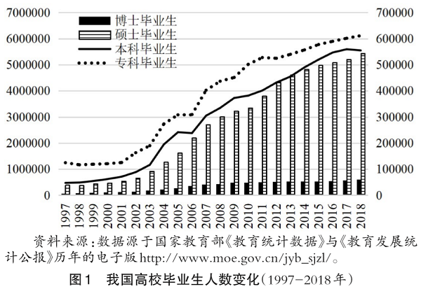 新中國成立70年來,特別是改革開放以來,我國高等教育快速發(fā)展。2018年,我國高校畢業(yè)生(含成人高校和網(wǎng)絡(luò)教育)達(dá)到1226.41萬人,是1997年的6.94倍,年均遞增9.20%。(見圖1)這是舉世矚目的巨大成就,創(chuàng)造了世界高等教育史上的奇跡。這既體現(xiàn)了黨和國家對(duì)于發(fā)展教育事業(yè)的高度重視和大力支持,也凸顯了我國國家制度和國家治理體系的發(fā)展成就和顯著優(yōu)勢,還證實(shí)了中國特色大學(xué)治理體系的效能。取得的成績來之不易、令人振奮,積累的經(jīng)驗(yàn)彌足珍貴,應(yīng)當(dāng)倍加珍惜。要堅(jiān)決維護(hù)黨中央權(quán)威和集中統(tǒng)一領(lǐng)導(dǎo),深刻認(rèn)識(shí)中國特色社會(huì)主義制度和國家治理體系的科學(xué)內(nèi)涵和本質(zhì)特征,深刻認(rèn)識(shí)這一制度和體系擁有顯著優(yōu)勢的根本原因,更加堅(jiān)定自信,搶抓歷史機(jī)遇,防范風(fēng)險(xiǎn)挑戰(zhàn),扎根中國大地辦大學(xué)。