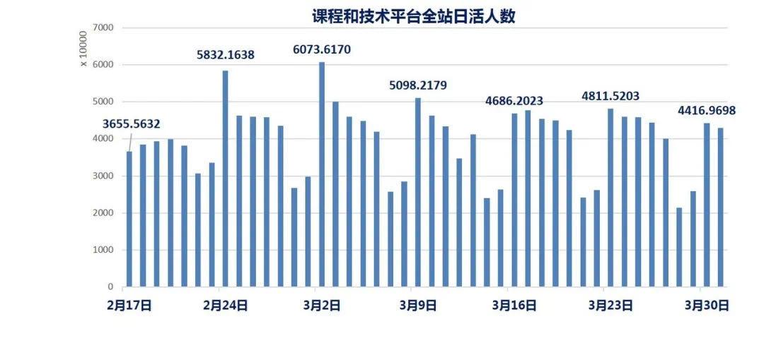 高等教育司迅速組織37 家基礎好、實力強的在線課程平臺和技術平臺(見表1),率先向全國高校免費開放4.1 萬門慕課和虛擬仿真實驗課等在線課程,帶動110 余家社會和高校課程在線平臺積極參與。愛課程(中國大學MOOC)、學堂在線、智慧樹、人衛慕課、好大學在線和華文慕課等,表現非常出色。疫情期間,各種平臺除了此前提供的課程外,新增慕課達5000門。為教師開設的在線教學技術、方法等方面的培訓大幅增加,參與培訓的師資新增394萬人次。提供其他形式的在線課程達18400門(見圖1)。豐富多彩的各類教學資源,有力支撐了高等教育在線教學工作的順利開展。以教育部首批和第二批公布的37個課程和技術平臺為例, 2月17日、2月24日、3月2日這幾個開學高峰日平臺日活躍人數在3600多萬人次到6000多萬人次之間,之后穩定在5000萬人次左右(見圖2),這些都是天文數字。這37個平臺,外加其他多個平臺,保證了教學工作的順利開展。雖然運行過程中也遇到過一些網絡卡頓和擁堵,但經過迅速調整,很快便都恢復正常運行。