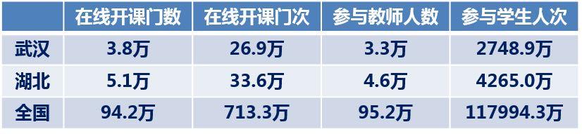 表2 武漢、湖北及全國在線開課情況與參與師生情況
