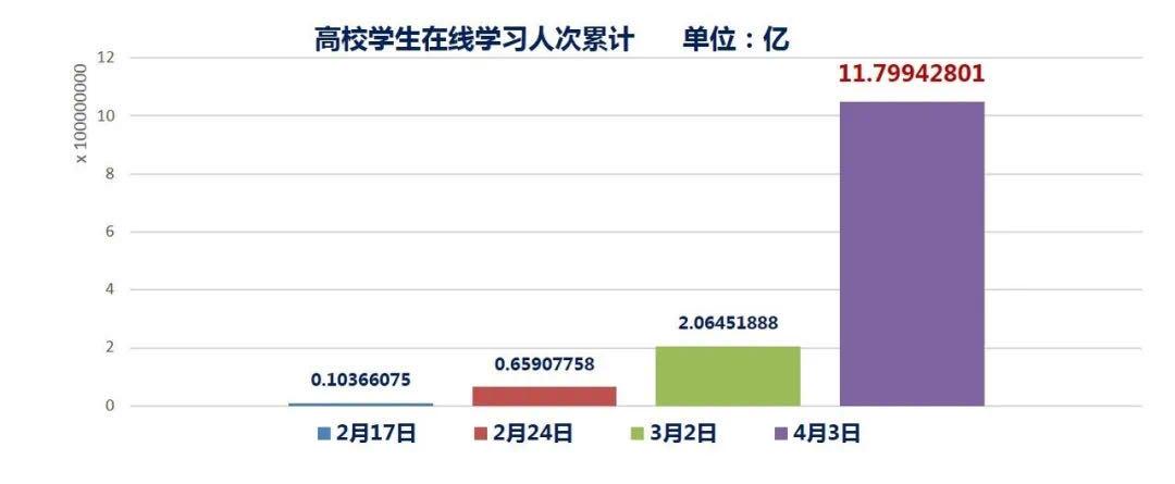 經過大量的數據監測和分析,我們取得了兩個重要成果。第一,在線教學實現了“三穩”,即穩住了武漢高校,穩住了湖北高校,穩住了全國高校。全國高校都實現了平穩的在線開學,學生開始進行正常的學習,教師開始進行正常的教學,學校開始進行正常的管理工作。從4月3日的數據可以看出,武漢高校共開出3.8萬門在線課程,湖北共開出5.1萬門在線課程,全國共開出94萬門在線課程。參與其中的教師,武漢有3.3萬名,湖北有4.6萬名,全國有95.2萬名,這是了不起的成績!從2月17日開學第一個高峰日至4月3日,僅47天,在線學習人數累計達到11.8億人次,實現了110多倍的增長(見表2、圖3)。我們真正兌現了“停課不停教、停課不停學”的承諾。
