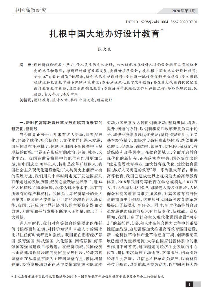 設計與人們的生產、生活、生態密不可分,通俗來講,設計就是通過創新思維把設想轉化為實施的計劃。設計解放和發展生產力,設計使人們的生活更加美好,設計改善了人們得以生存的生態環境,設計給人們帶來嶄新的生活方式。設計無處不在,事事都有設計。回望“大國重器、大國利器”的中國制造和偉大創造,從“兩彈一星”到南水北調工程,從高能物理世界一流大科學裝置到世界領先的高鐵路網,從神舟飛天、蛟龍潛海、到天眼觀宇,從北京大興機場通航到港珠澳大橋通車,都有優秀設計人才付出的汗水心血、做出的重要貢獻。作為培養未來設計人才的設計教育具有特殊重要的地位和作用,設計教育不可或缺、無法替代。今天設計教育的水平和人才培養質量將決定未來設計人才的素質和貢獻,決定設計的未來。