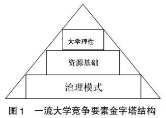 大學(xué)理性、物質(zhì)基礎(chǔ)及治理模式這三個(gè)要素構(gòu)成對(duì)一流大學(xué)建設(shè)發(fā)生影響的金字塔。(見(jiàn)圖1)首先,大學(xué)的學(xué)術(shù)屬性決定了其必須是一個(gè)自覺(jué)自律的理性組織,其行動(dòng)受制于大學(xué)理性且其行動(dòng)結(jié)果很大程度是被大學(xué)組織及其成員所持的理性預(yù)先決定的。一流大學(xué)建設(shè)必須以遵循大學(xué)辦學(xué)治校育人的屬性及規(guī)律為指導(dǎo),所以大學(xué)理性之于一流大學(xué)建設(shè)中具有置頂?shù)闹匾浴F浯危髮W(xué)是需要靠消耗大量資源以支撐的貴族型學(xué)術(shù)組織,對(duì)巨大資源的依賴是一流大學(xué)建設(shè)不可或缺的資源基礎(chǔ),由于資源之于任何一所大學(xué)都是有限的并非取之不盡用之不竭,所以即便在西方高等教育強(qiáng)國(guó),一流大學(xué)也只能是少數(shù)大學(xué)的理想和目標(biāo)。其三,上述兩個(gè)要素具備后,一流大學(xué)能否建成則完全取決于大學(xué)的內(nèi)部治理模式,所以治理模式是一流大學(xué)建設(shè)底部厚重的不可逾越的操作性基礎(chǔ),對(duì)一流大學(xué)建設(shè)的得失成敗具有決定性的作用。