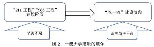 然而,若要在較短的時(shí)間內(nèi)把建成世界一流大學(xué)這一仰望星空的理想變?yōu)槟_踏實(shí)地的現(xiàn)實(shí)并非易事。如圖2所示,筆者把改革開(kāi)放后40年我國(guó)的世界一流大學(xué)建設(shè)分為兩個(gè)階段:第一輪的世界一流大學(xué)建設(shè)從1998年提出,是“985工程”“211工程”建設(shè)階段;第二輪的世界一流大學(xué)建設(shè)從2015年開(kāi)始,是“雙一流”建設(shè)階段,兩個(gè)階段正好相隔20年。在世界一流大學(xué)建設(shè)兩個(gè)階段的20年間我們都遇到了建設(shè)發(fā)展中的瓶頸。第一個(gè)瓶頸是“985工程”“211工程”期間的“經(jīng)費(fèi)短缺”,該階段我國(guó)主要通過(guò)加大投入解決一流大學(xué)建設(shè)的資金困窘問(wèn)題。但由于長(zhǎng)期積淀下來(lái)的高等教育投入不足缺口較大,這一輪的世界一流大學(xué)建設(shè)的經(jīng)費(fèi)更多用于整體辦學(xué)條件的改善;第二個(gè)瓶頸是進(jìn)入“雙一流”建設(shè)階段后如何解決“治理效率不高”的問(wèn)題,因?yàn)樵谥贫裙┙o和資源供給的問(wèn)題都已經(jīng)得到根本解決的前提下,如果我們的“雙一流”建設(shè)成效不佳就不能再以制度供給不足、資源不足等外部環(huán)境不夠好為借口加以推脫。若真是這樣,中央高層以“雙一流”建設(shè)取代“985工程”“211工程”的意義和價(jià)值則會(huì)受到人們的質(zhì)疑。