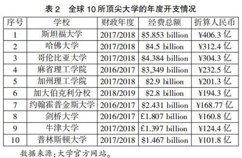 大學(xué)理性的問(wèn)題學(xué)界已經(jīng)討論很多了,不必贅述。近3年我國(guó)在經(jīng)費(fèi)預(yù)算排名前10位的一流大學(xué)建設(shè)高校基本呈逐年增加的趨勢(shì),至2018年預(yù)算最低的武漢大學(xué)也達(dá)93.5億元人民幣,而清華大學(xué)高達(dá)269.5億元人民幣。盡管從決算情況看,上述大學(xué)都有不同程度的降低,但總體而言,絕大多數(shù)大學(xué)的預(yù)決算都呈逐年增加的趨勢(shì),有些大學(xué)增速十分驚人。如清華大學(xué)2017年的預(yù)算比2016年增加了51.1億元人民幣,決算增加了24.99億元人民幣,每年預(yù)決算增幅數(shù)億及上10億元人民幣的大學(xué)亦非少數(shù)。(見(jiàn)表1)為便于與歐美一流大學(xué)對(duì)照,筆者請(qǐng)熊萬(wàn)曦博士據(jù)相關(guān)大學(xué)官網(wǎng)公布的最新數(shù)據(jù),就2018年US. News世界大學(xué)綜合實(shí)力排名前10位大學(xué)的年度經(jīng)費(fèi)開(kāi)支情況制作了表2。其中年度開(kāi)支最高的是斯坦福大學(xué)為58.53億美元(折合人民幣 406.3億元),普林斯頓大學(xué)最少為14.67億美元(折合人民幣 101.8億元)。由此可以得到結(jié)論,無(wú)論中國(guó)還是歐美,凡一流大學(xué)無(wú)不是強(qiáng)資源依賴型學(xué)術(shù)組織。